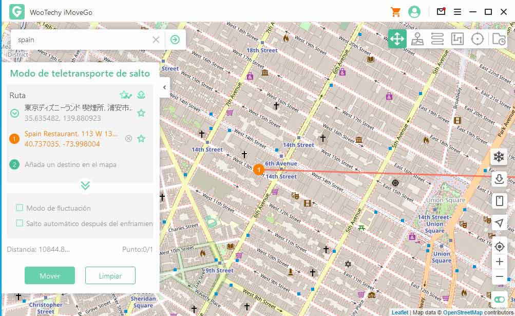 Paso 2. Haz clic en el mapa para seleccionar una ubicación o introduce el lugar que desees en la barra de búsqueda. Pulsa el botón Movery listo. (El modo de teletransporte por salto le permite planificar previamente varios lugares y moverse uno tras otro).