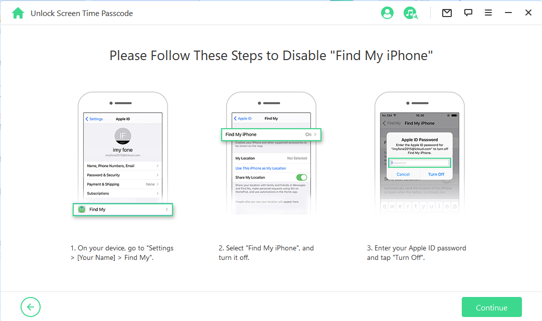 You should follow the onscreen instructions to disable "Find My iPhone" on your device at first. Then, click "Continue" to proceed.