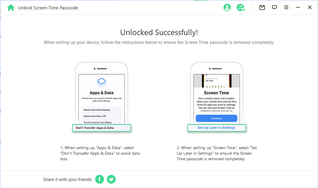 The process only takes a few minutes. After the removal, you need to set up your device. When prompted, follow the onscreen instructions to make sure the Screen Time passcode is removed completely.