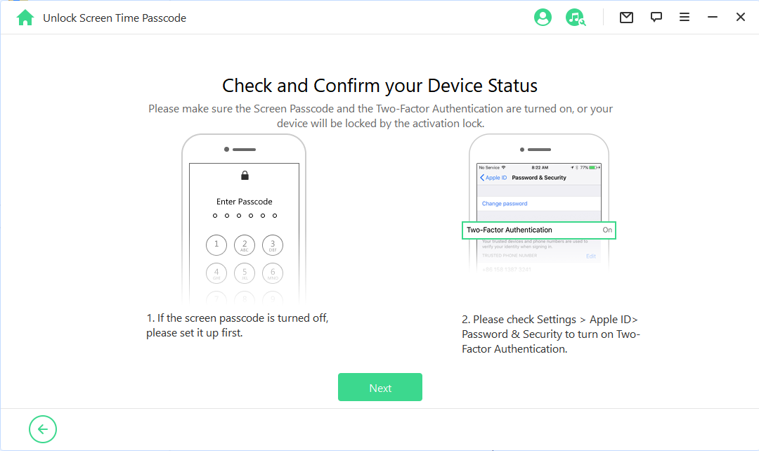 Make sure the Screen Passcode and Two-Factor Authentication are turned on. If everything is done, click on "Next"