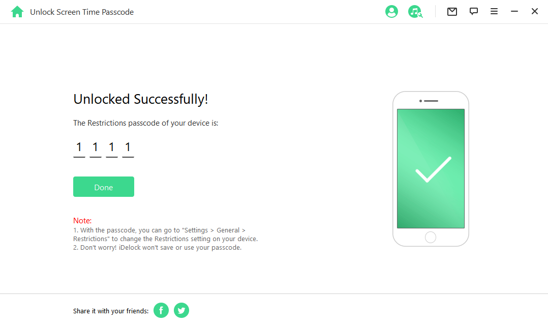When the process finishes, iDelock will show you the current Restrictions passcode of your device. You can use it to unlock the Restrictions and change the Restrictions setting from "Settings > General > Restrictions".