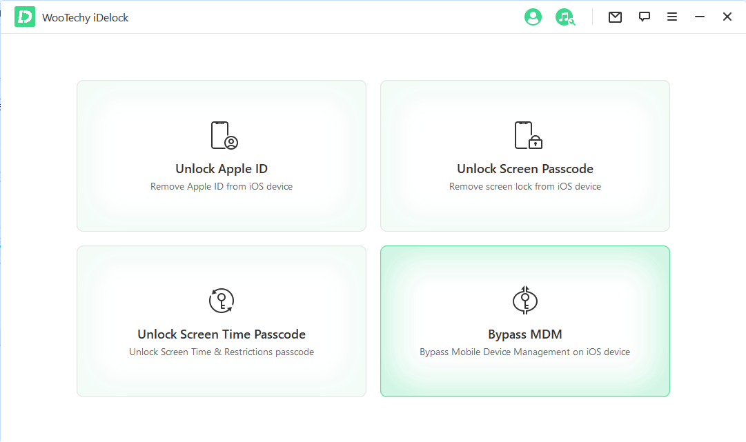 Launch WooTechy iDelock on your computer and select the "Bypass MDM" mode.
