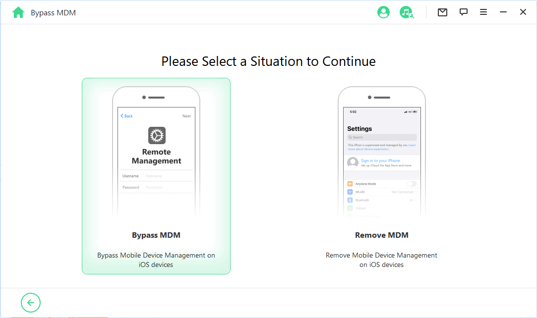 If your device is locked out of the MDM lock screen, select "Bypass MDM" to start.