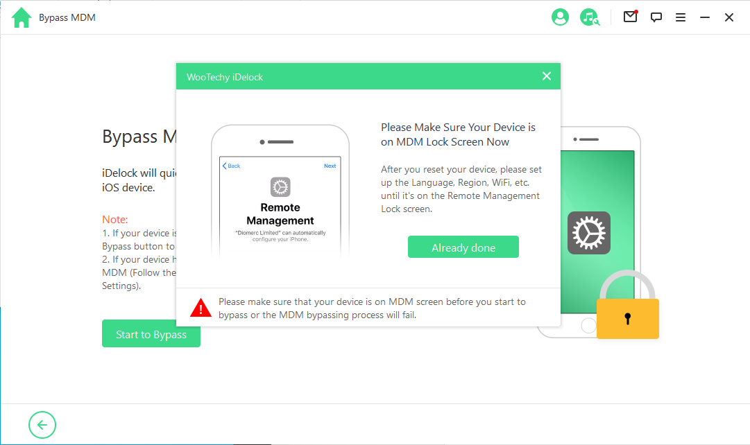 Note: The MDM will appear again if you reset your device after bypassing, while you can use iDelock on the same device before the license expires.